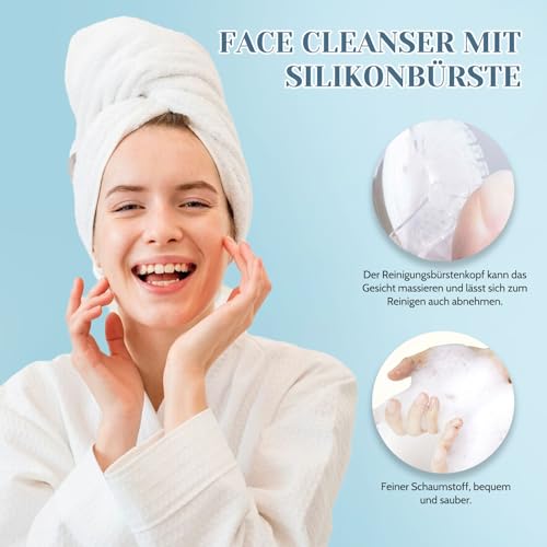 Integrierte Gesichtsreinigungsbürste: Die weiche Silikonbürste bietet eine sanfte, aber tiefgehende Reinigung. Sie unterstützt, mit Mitesser zu arbeiten, Poren zu klären und die Durchblutung zu fördern – für eine glatte und strahlende Haut.