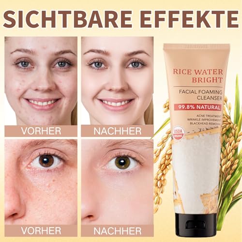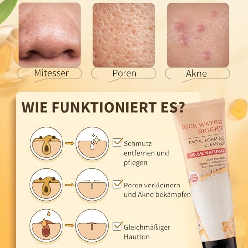 Tiefenreinigung & Porenverkleinerung: Dank der einzigartigen Reisextrakt-Formel wirkt der Anti-Falten Gesichtsreiniger tiefenwirksam, reduziert Akne und verfeinert die Poren. Er löscht Unreinheiten und hilft dabei, schwarze Pusteln zu reduzieren.