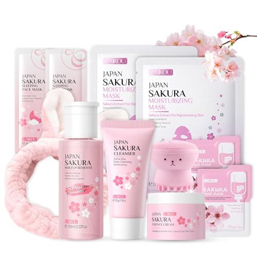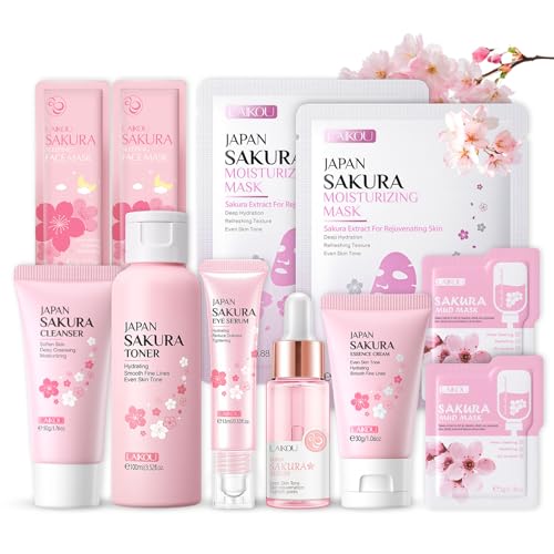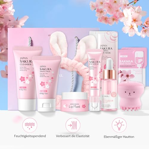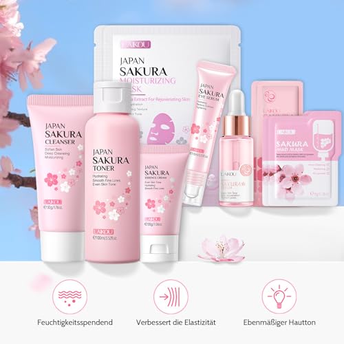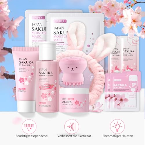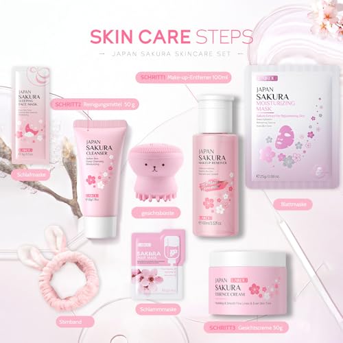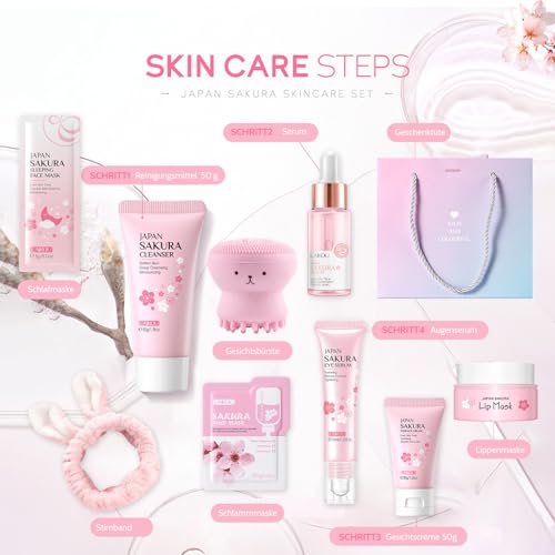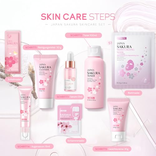 🌸 Komplett Pflegeerlebnis: Das Sakura Hautpflege Set enthält alles, was Sie für Ihre tägliche Routine brauchen: Reinigungsschaum, Gesichtswasser, Serum, Gesichtscreme, Augenpflege, Reinigungsmasken, Sheet-Masken und Schlafmasken.